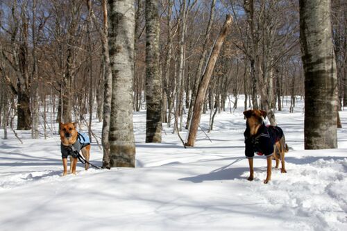 すっかり春めいてきて、雪がなくなってしまう前にと、ルーキーのオビディエンスクラスメイトで、ルーキーに似ているラビちゃんと雪遊びに行ってきました。 当日は快晴、まずはスキー場駐車場からブナ林のなかをサクサクお散歩 スキー場の圧雪車。しっかりピ…
